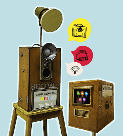 Entièrement manufacturées par nos soins, les bornes Photomatik ont un design unique. Leur look vintage fait mouche dans tous les événements. Les bornes sont fabriquées avec des matériaux de récupération dans un soucis de respect de l’environnement.
